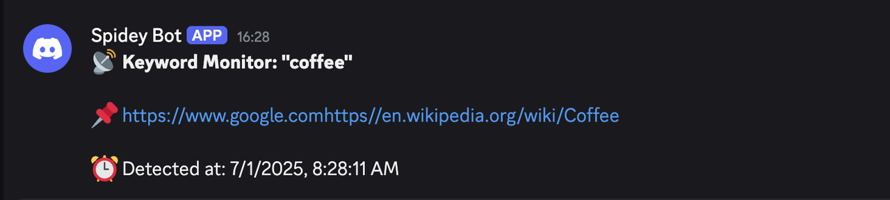 content: `📡 **Keyword Monitor: "coffee"**\n\n${lines}\n\n⏰ Detected at: ${new Date().toLocaleString()}`