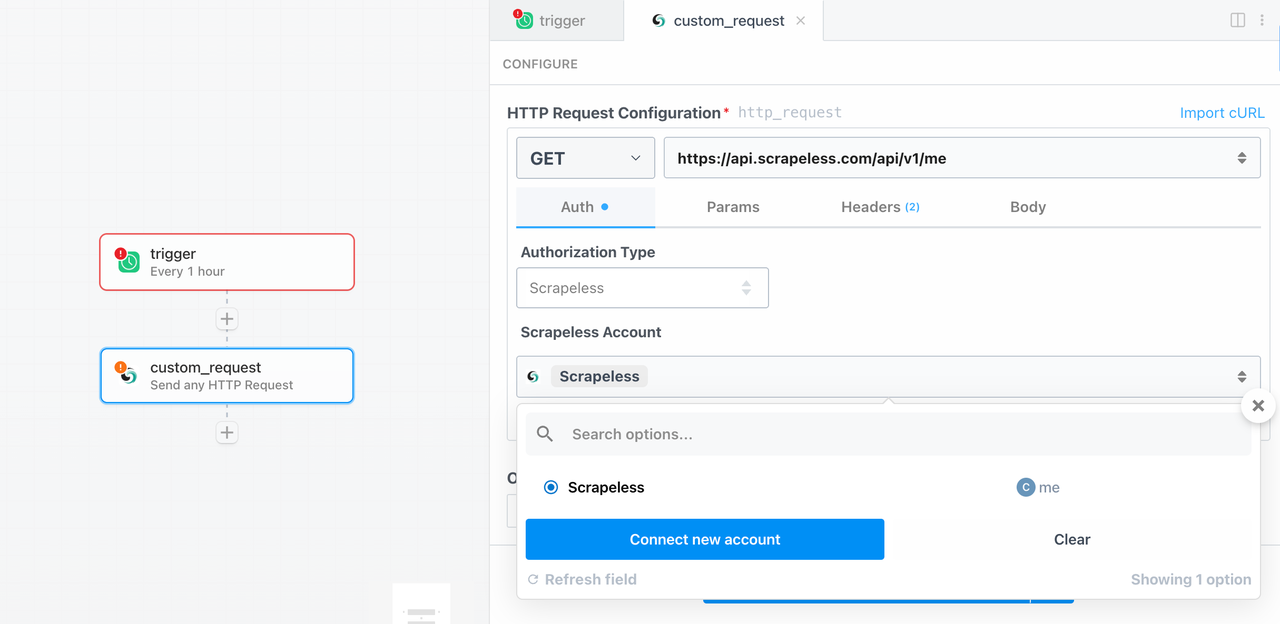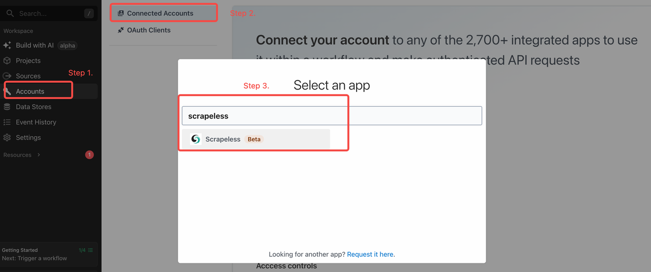 You need to log in to your Scrapeless account and go to the dashboard to obtain your API key. Once you have it, go to the “Accounts” tab in Pipedream and add the key there, as shown below: