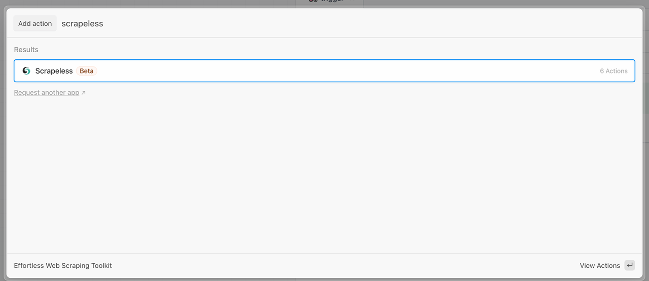 - Now, let’s add an action step to the Pipedream workflow. From the Actions dropdown menu, select Scrapeless:
